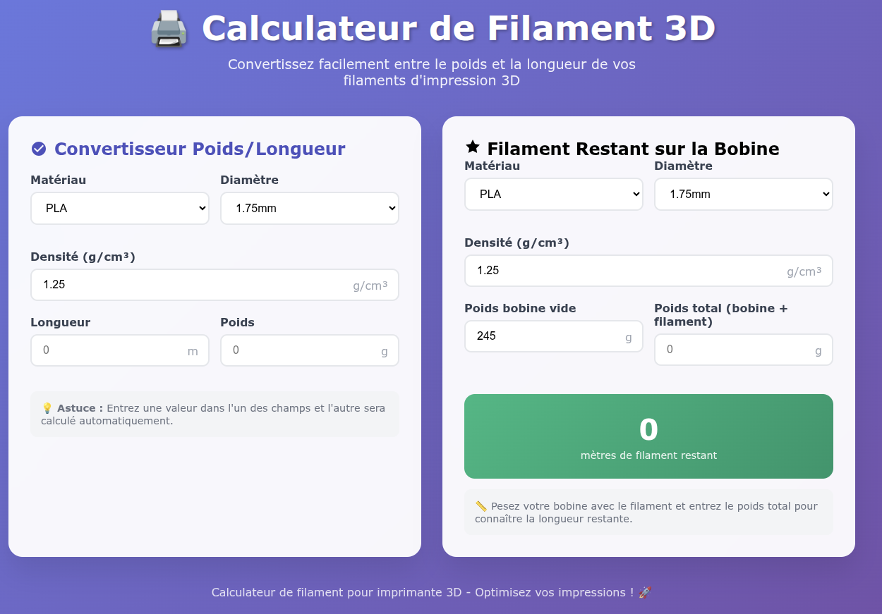 Une application web indispensable pour les passionnés d'impression 3D. Cet outil permet de jongler facilement entre le poids (grammes) et la longueur (mètres) de vos bobines, tout en proposant une fonction précise pour estimer le filament restant sur une bobine entamée.