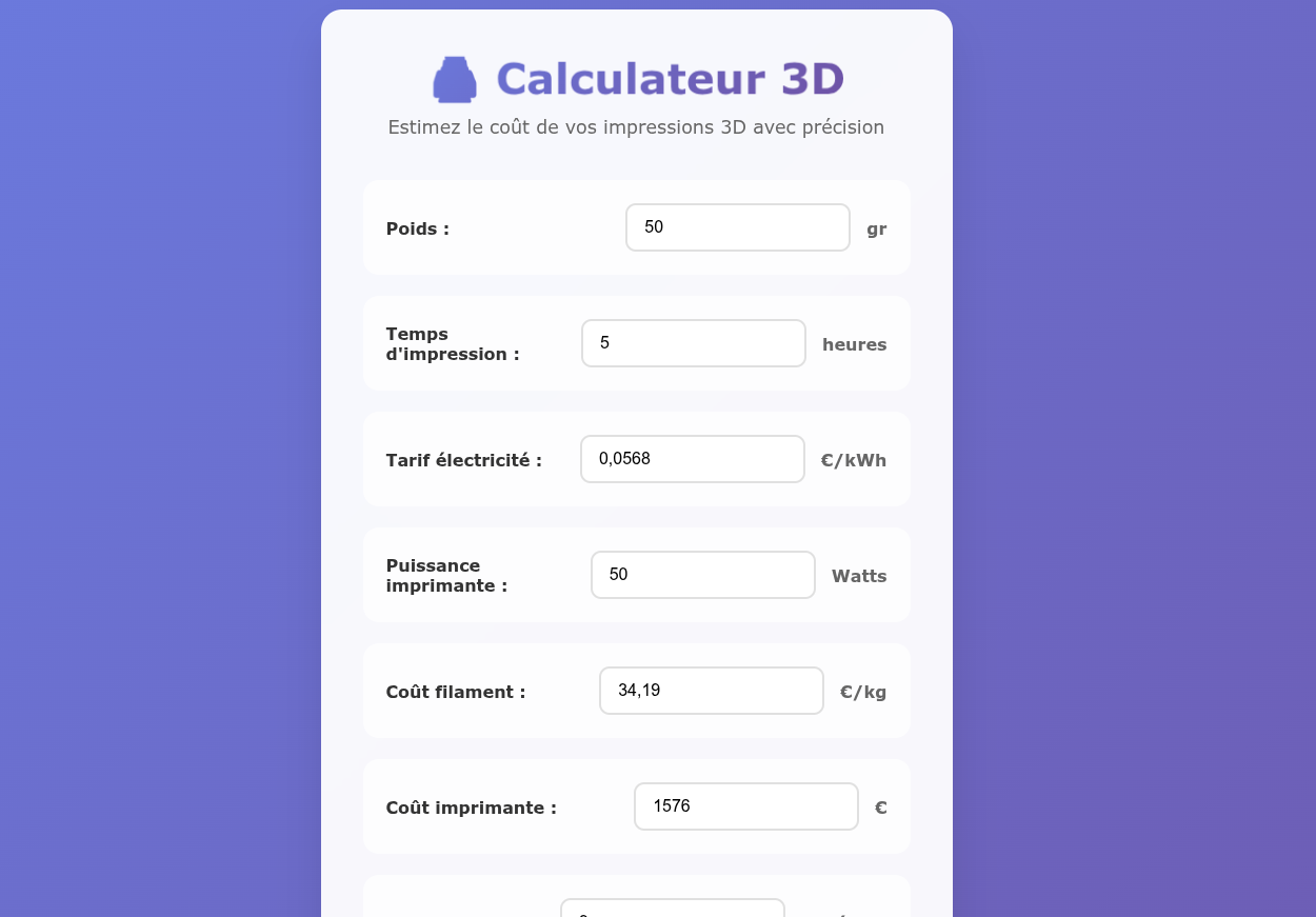 Une application web légère et élégante permettant d'estimer avec précision le coût de revient d'une impression 3D. Elle prend en compte non seulement la matière première, mais aussi l'amortissement de la machine, l'électricité et les risques d'échec.