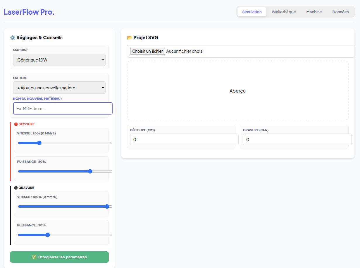 LaserFlow Pro est une application web légère et performante conçue pour les ateliers de découpe et de gravure laser. Elle permet d'estimer avec précision le temps de production à partir de fichiers SVG et de gérer une bibliothèque personnalisée de matériaux.