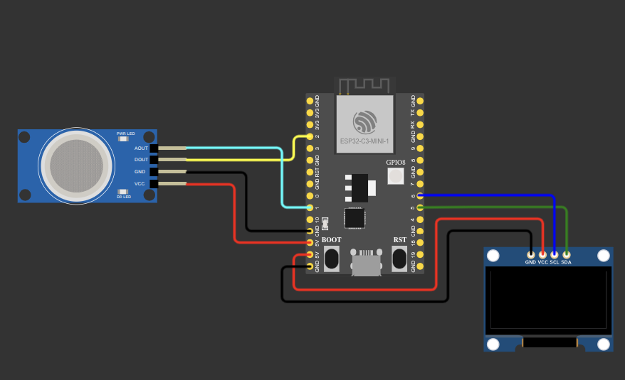 - connections: "gas1:VCC", "esp:5V.1", "red" "gas1:GND", "esp:GND.4", "black" "gas1:DOUT", "esp:2", "yellow" "gas1:AOUT", "esp:1", "cyan" "oled1:SDA", "esp:5", "green" "oled1:SCL", "esp:6", "blue" "oled1:VCC", "esp:5V.2", "red" "oled1:GND", "esp:GND.5", "black"